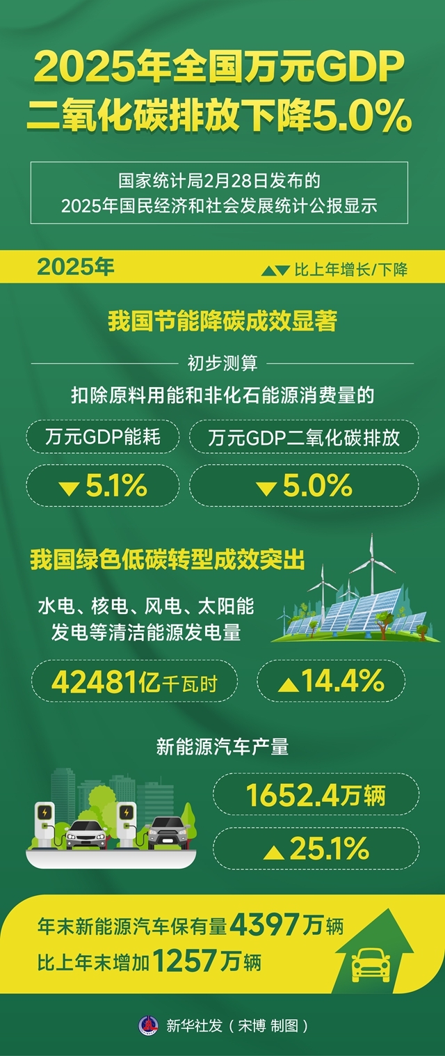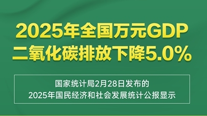 國家統計局2月28日發佈的2025年國民經濟和社會發展統計公報顯示,2025年我國節能降碳成效顯著,初步測算,扣除原料用能和非化石能源消費量的萬元GDP能耗比上年下降5.1%,萬元GDP二氧化碳排放下降5.0%。